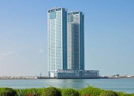 A modern city skyline with unique architecture and waterfront view under a clear blue sky.